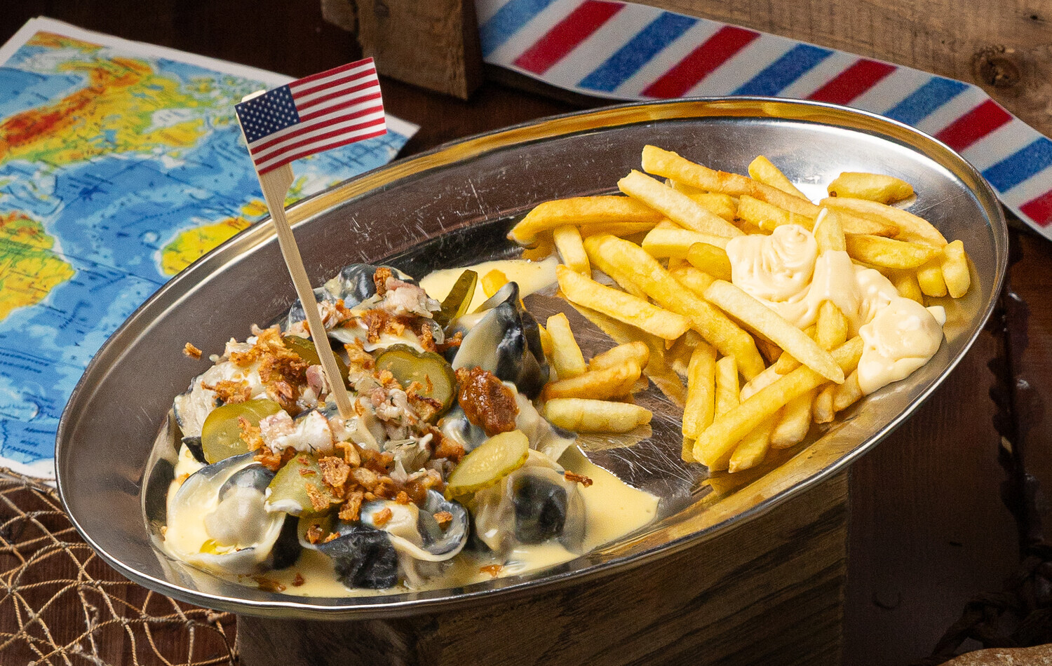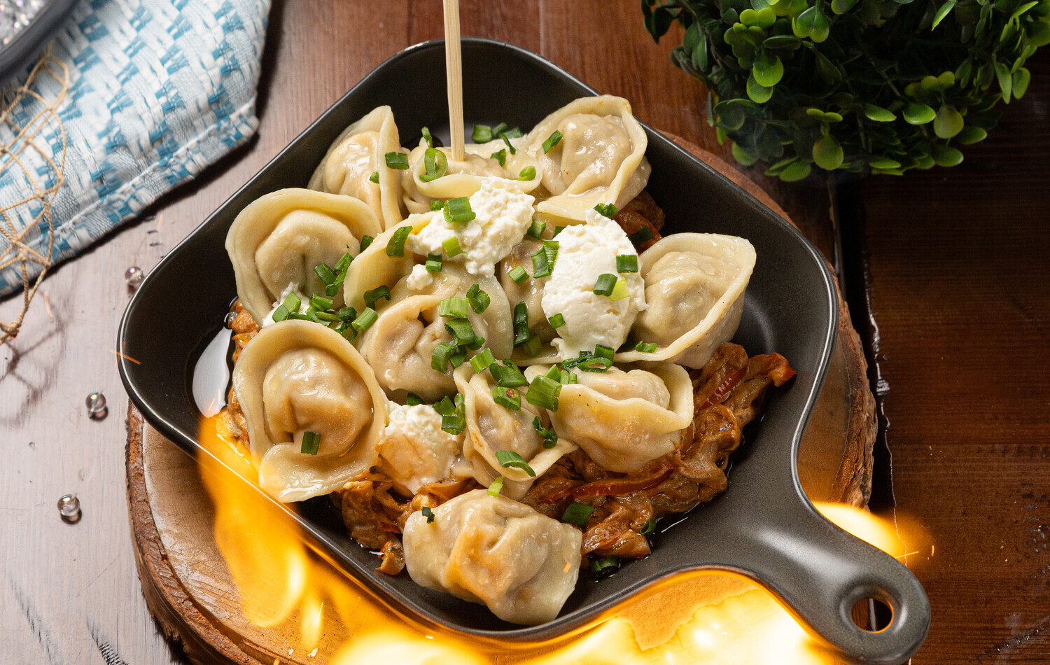 Пельмени с балканским настроением! Нежный фарш из говядины и свинины с тягучей моцареллой на ароматной подушке из айвара